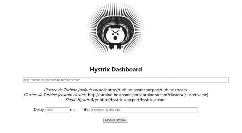 到这里我们已经完成了基本配置,接下来我们可以启动该应用,并访问: http://localhost:1301/hystrix ,我们可以看到如下页面: