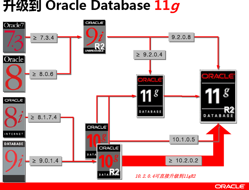 下图是Oracle数据库升级路线,从图看到Oracle10.2.0.1不能直接升级到11gR2版本,至少需要先升级到10.2.0.2以后才可以升级到11gR2,必须是10.2.0.2以上或者是10.1.0.5版本才可以直接升级到11gR2。