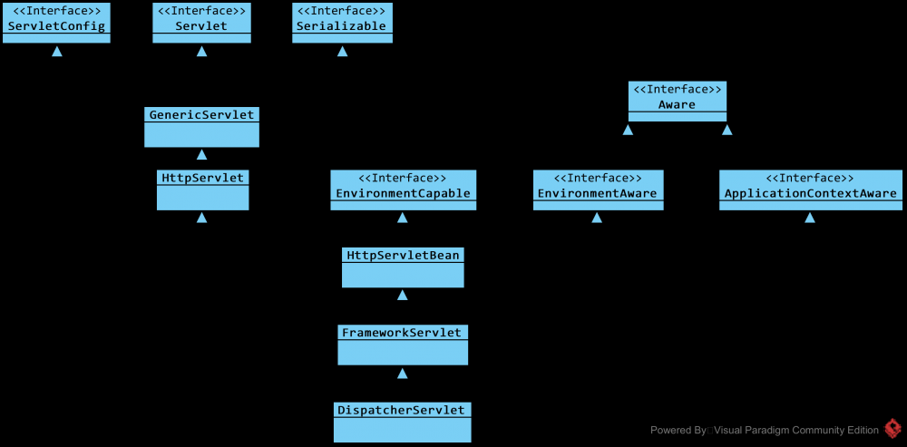 上图是 DispatcherServlet 的继承关系图,其中左上角的 5 个接口(类)属于 jdk 中定义的接口(类),包括我们在基于原生 servlet 编写 web 程序时经常用到的 HttpServlet。