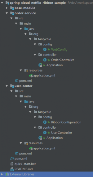 创建两个项目:order-service(订单服务,作为服务提供者)、user-center(用户中心,作为服务消费者)。并在 user-center(服务消费者)端使用 Spring Cloud Ribbon 做客户端负载均衡。