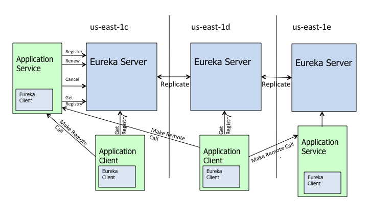 Eureka Client是Eureka Server客户端组件库,可以基于它向Eureka Server注册服务,供服务调用方调用;也可以是一个服务调用方,通过检索服务并调用已经注册的服务。如上图所示,Application Service和Application Client都是基于Eureka Client开发的使用Eureka Server的服务。另外,Eureka Client提供了内置的Load Balancer,实现了基本的Round-robin模式的负载均衡。