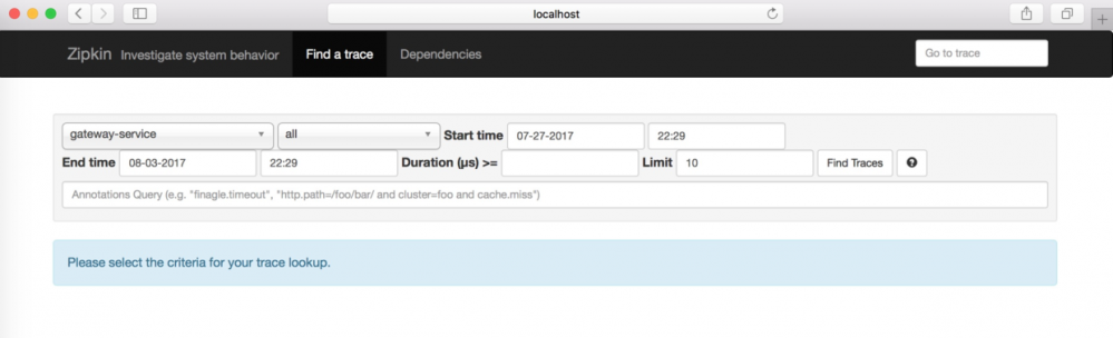 访问 http://localhost:9411,即访问Zipkin的展示界面,界面显示如图1所示: