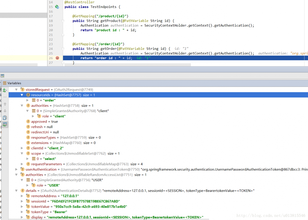 我们重点关注一下debug后,对资源访问时系统记录的用户认证信息,可以看到如下的debug信息