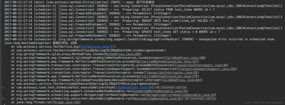 当然,Spring中事务回滚是有触发机制的,其触发机制就是抛出unchecked异常,即RuntimeException及其子类异常。即上述代码中的实现: