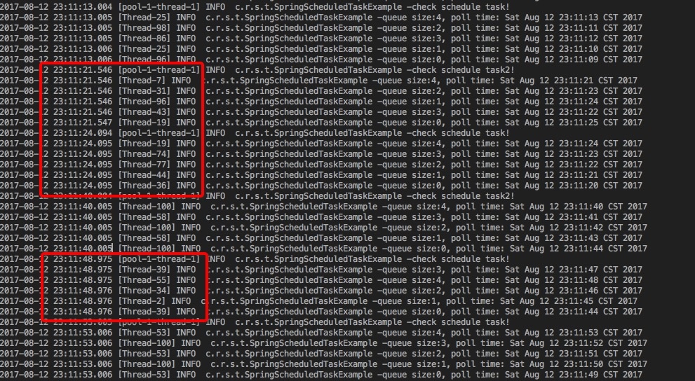 加载上下文后,会有两个任务提交到线程池,先提交到线程池会首先创建线程立即处理,而第二个因为超过coreSize=1,所以会被放入阻塞队列等待空闲线程去执行。而且如果任务本身的时间超过定时任务本身的定时间隔,那么下次执行的时间也会相应拉长,目前这个例子是超过10s的话,下次执行定时任务的间隔会延长到20s。