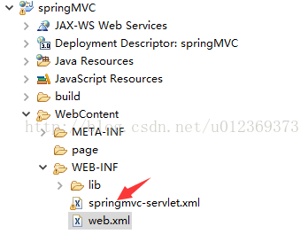 其中servlet元素中的load-on-startup是可选的,如果有的话,则在项目启动的时候就会加载被加载并调用其init方法,如果没有该元素,则会在该servlet第一次被请求的时候加载。init-param元素中配置的是SpringMVC配置文件的路径,如果没有该元素,则DispatcherServlet会默认寻找WEB-INF目录下以servletName-servlet.xml命名的SpringMVC配置文件。项目结构如图: