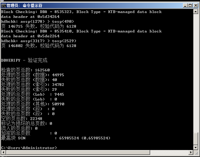 分析结果发现SYSAUX01.DBF文件数据块(Data)检测失败40页,索引页(Index)检测失败29页,其他文件检测正常。