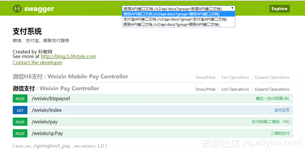 前段时间整合过的一个 支付服务 ,由于使用了Spring Boot快速开发,但是又懒得写详细的文档介绍,便顺手就把Swagger整合进来了,对支付服务进行分组API展示,如上图。