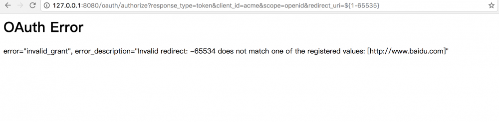 SpEL表达式,当函数将error="invalid_grant", error_description="Invalid redirect: ${1-65535} does not match one of the registered values: [http://www.baidu.com]"中的1-65535提取出来并解析了。于是1-65535被执行了。这也符合了官方的描述。 整理整个流程如下: