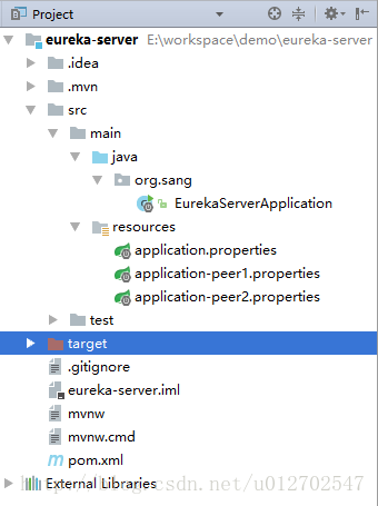 在上篇博客中,我们创建了一个名叫eureka-server的服务注册中心,那么在本文中,我将修改这个工程的配置文件,进而将其启动多次。如下,我向这个工程中添加两个配置文件application-peer1.properties和application-peer2.properties:
