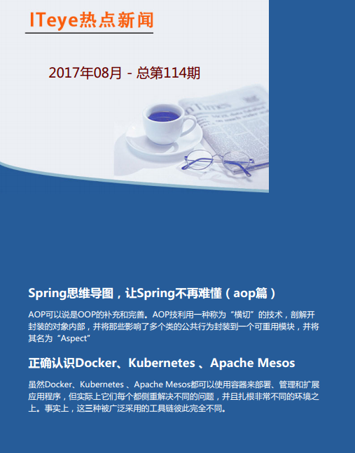 ITeye新闻热点月刊总第114期(2017年8月版)发布了!制作精美,内容丰富,为您总结一个月最精彩的技术新闻。