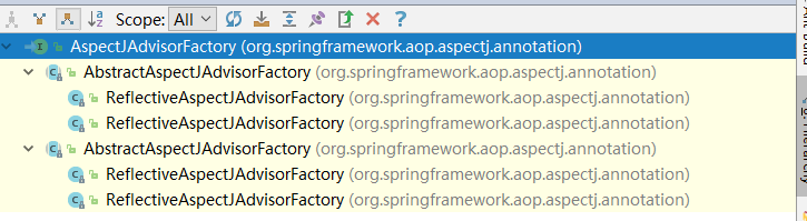 由上段代码最后 this.advisorFactory.getAdvisors(factory) 可以看到这段就是获取通知器的代码,而看源码,是由AspectJAdviosrFactory 接口的getAdvisors()方法实现,下图是AspectJAdviosrFactory 的继承关系图