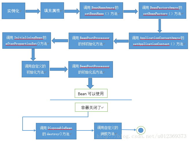 如果bean实现了DisposableBean接口,Spring将调用它的destroy()接口方法;同样,如果bean使用destroy-method声明了销毁方法,该方法也会被调用。