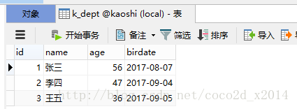 INSERT INTO `k_dept` VALUES ('1', '张三', '56', '2017-08-07');