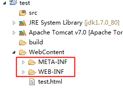 其中WebContent目录即为网站内容。在里面添加一个test.html,Run as Server 到tomcat,通过 http://localhost:8080/test/test.html 即可访问到这个页面。