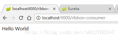 首先我们分别启动服务注册中心,再启动两个服务提供者的实例,端口号分别是8080和8081,然后再启动一个服务消费者,服务消费者的端口号为9000,这几个都启动成功之后,我们访问 http://localhost:9000/ribbon-consumer 这个地址,可以看到如下效果: