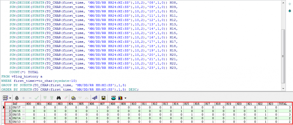 SUM(DECODE(SUBSTR(TO_CHAR(first_time, 'MM/DD/RR HH24:MI:SS'),10,2),'01',1,0)) H01,