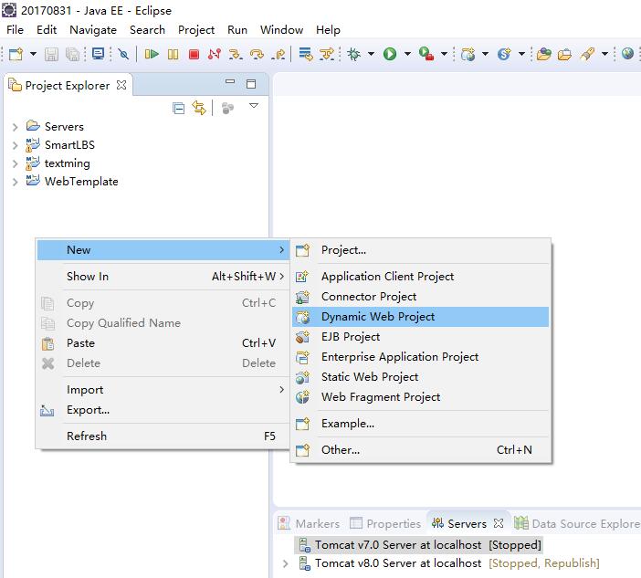 在这里,我们首先创建一个Dynamic Web Project项目。填好项目名称之后,直接点击Finish即可(不用next,这里我们用后面默认的配置)。然后,右键单击项目名称,依次选择Configure - Convert To Maven Project。将该项目转换成Maven的项目。这样,一个基于Maven的Web项目就建好了。可能有人问为啥不直接使用Maven创建。因为Eclipse的Maven插件提供的Web原型版本太低,而且常年不更新,和新的jdk版本搭配在一起很容易出错。所以我们采用这种方式。