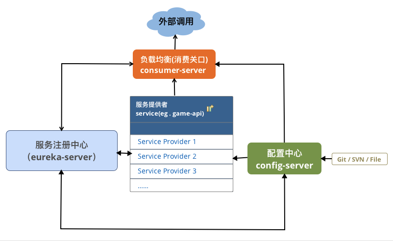 我的思路是根据功能区分进行解耦,把各个功能独立出来成为一个服务中心,然后服务中心对外提供api,有需要访问该功能服务的,就请求访问该api即可。比如获取游戏列表资料、会员资料维护、会员头像维护、会员储值资料维护、游戏接口对接等等,都可以独立成为服务中心并对外提供接口访问。基于这样的思路,发现近两年很火的微服务很适合这样的架构,而spring cloud则是比较容易入手且相对应用也比较广泛的微服务解决方案,于是决定根据实际需要采用spring cloud里的部分模块来解决问题。