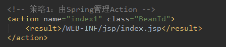 在该策略中,当我们配置struts.xml配置文件的Action的class属性时,不需要编写完整的Action类路径,只需要编写Action类在Spring容器中对应的Bean的id即可。在这里我们配置的class的值为“BeanId”,它不是一个类路径,我们称其为“代理Id”。