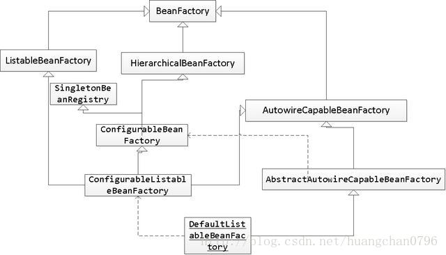 在Spring中,最基本的IOC容器接口是BeanFactory 。这个接口为具体的IOC容器的实现作了最基本的功能规定, 看如下类图,体现了Beanfactory的体系结构