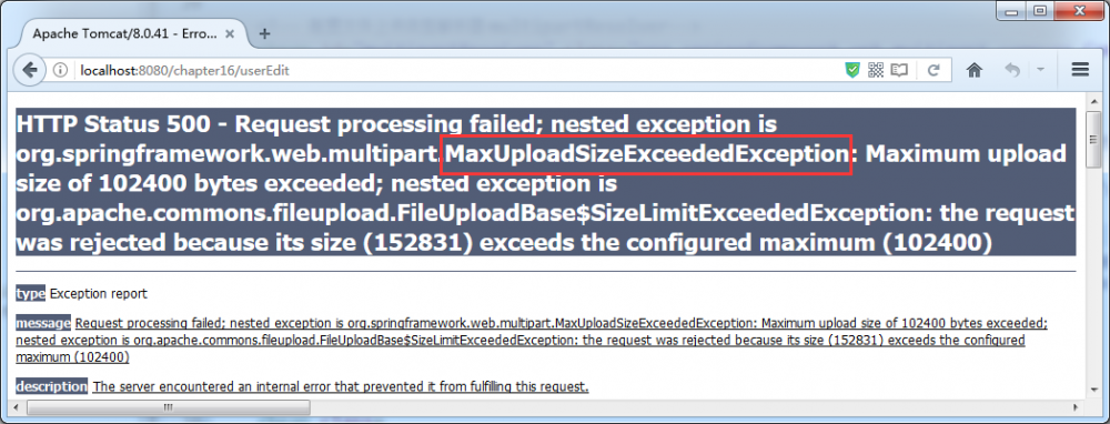 //当上传文件大小超过指定大小限制后,模拟抛出MaxUploadSizeExceededException异常