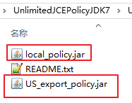 默认情况下我们的JRE中自带了JCE(Java Cryptography Extension),但是默认是一个有限长度的版本,我们这里需要一个不限长度的JCE,这个JCE我们可以直接百度然后在Oracle官网下载,下载之后解压,我们可以看到如下三个文件: