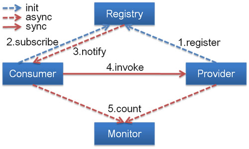 服务消费者向注册中心获取服务提供者地址列表,并根据负载算法直接调用提供者,同时汇报调用时间到监控中心,此时间包含网络开销