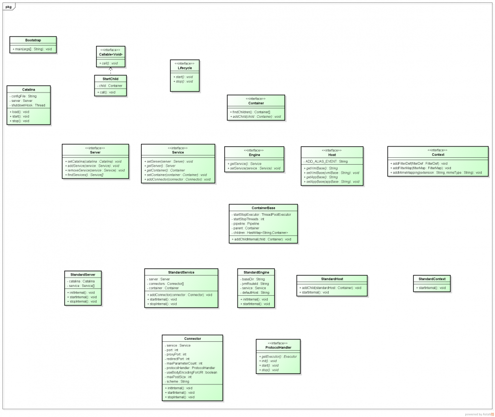 Server,Service,Engine,Host,Context依次是包含关系。他们自身实现了特定的功能方法。