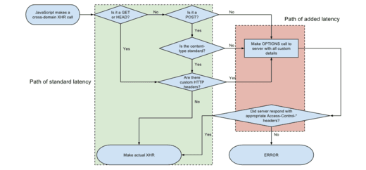 CORS实现跨域访问并不是一蹴而就的,需要借助浏览器的支持,从原理题图我们可以清楚看到,简单的请求(通常指GET/POST/HEAD方式,并没有去增加额外的请求头信息)直接创建了跨域请求的XHR对象,而复杂的请求则要求先发送一个”预检”请求,待服务器批准后才能真正发起跨域访问请求。