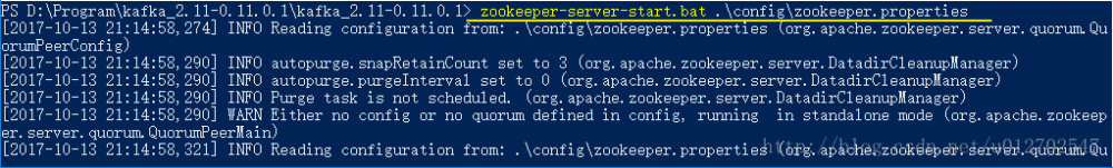 下载成功之后,是一个压缩文件,解压该文件,我们可以看到一个bin目录,进入到bin目录中,bin目录下的.sh文件都是Linux/Unix下的shell脚本,在Linux/Unix环境下直接运行这些脚本即可,bin目录中还有一个windows目录,该目录下存储的都是windows中的批处理文件。我们在运行时根据自己的操作系统选择合适的命令去执行,本文以windows为例。解压后为了后面的命令操作方便,我将windows文件配置到环境变量中,我的是 D:/Program/kafka_2.11-0.11.0.1/bin/windows ,然后在cmd中进入到解压目录下,执行 zookeeper-server-start.bat ./config/zookeeper.properties 命令,表示启动zookeeper(由于Kafka依赖的zookeeper,所以我们要先启动zookeeper再启动Kafka),如下:
