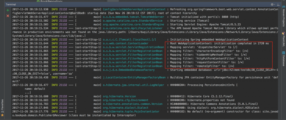 通过 mvn spring-boot:run 启动项目,可以在终端中看到如下的输出信息,证明RemoteIPFilter已经添加成功。入下图所示: