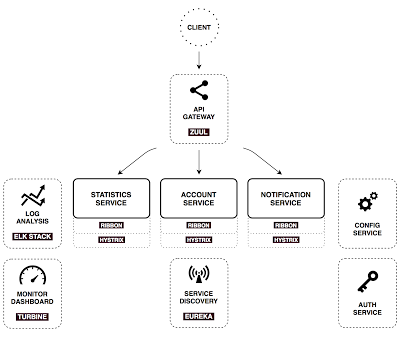 最近我读了A. Lukyanchikov写的一篇非常精彩的文章,讲的是用Spring Cloud和Docker来构建微服务架构。如果你还没读过,你应该读一下,因为它给出了一个关于如何利用Spring Cloud来创建一个简单的基于微服务的系统的综合视角。为了构建一个能扩展到数千个服务的可扩展且有弹性的微服务系统,它就必须有一套拥有广泛的构建时和运行时能力的工具集来帮助管理和控制。使用Spring Cloud,既能实现功能型服务(比如统计服务,账号服务以及通知服务),又能实现基础架构服务(比如日志分析,配置服务器,服务发现,认证服务等)。描述这样一个使用Spring Cloud构造的微服务架构(MSA)图如下所示: