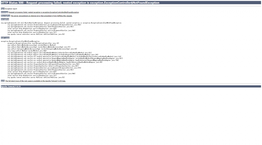 默认如果我们在controller中抛出异常,Spring MVC会给用户响应500页面,并包含详细的错误信息。
