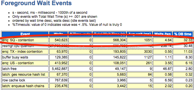 偶而一次性同时创建许多会话,有时会发生enq:SQ-contention等待事件,其理由是V$SESSION.AUDSID(auditing sessionid) 列值是利用Sequence创建的,oracle在创建新的会话后,利用名为SYS.AUDSESS$的sequence的nextval创建AUDSID的值,SYS.AUDSESS$ Sequence的CACHE大小的缺省值设定为 20,许多会话同时连接,可以将SYS.AUDSESS$ sequence的CACHE大小扩大至1000,以此可以解决 enq:SQ-contention等待问题。