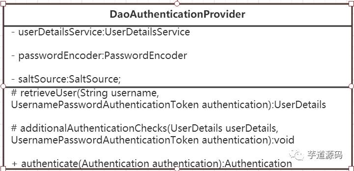 AuthenticationProvider最最最常用的一个实现便是DaoAuthenticationProvider。顾名思义,Dao正是数据访问层的缩写,也暗示了这个身份认证器的实现思路。由于本文是一个Overview,姑且只给出其UML类图:
