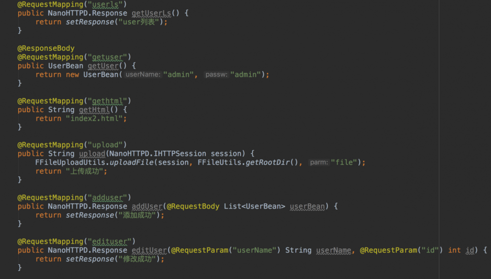 是根据 NanoHttpd 二次开发,主要使用了注解反射来实现url的映射,代码也不多,轻量级,以下是关键代码