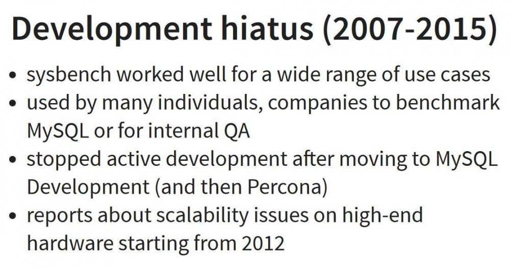 对于sysbench的学习如果有这样的方式也是极好的,所以我们就可以想办法找找sysbench作者的心路历程。自从0.5版本之后,有相当长的一段时间就没有深入维护了。