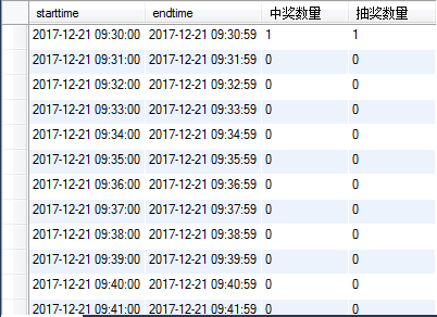 思路就是用数字辅助表, 活动期间每分钟都生成一条记录.然后用左连接 匹配有抽奖中奖的记录