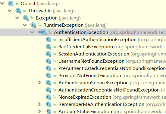 此时用户才被认证通过,上述步骤有一个错了会抛出AuthenticationException中的子异常,下面是其继承图: