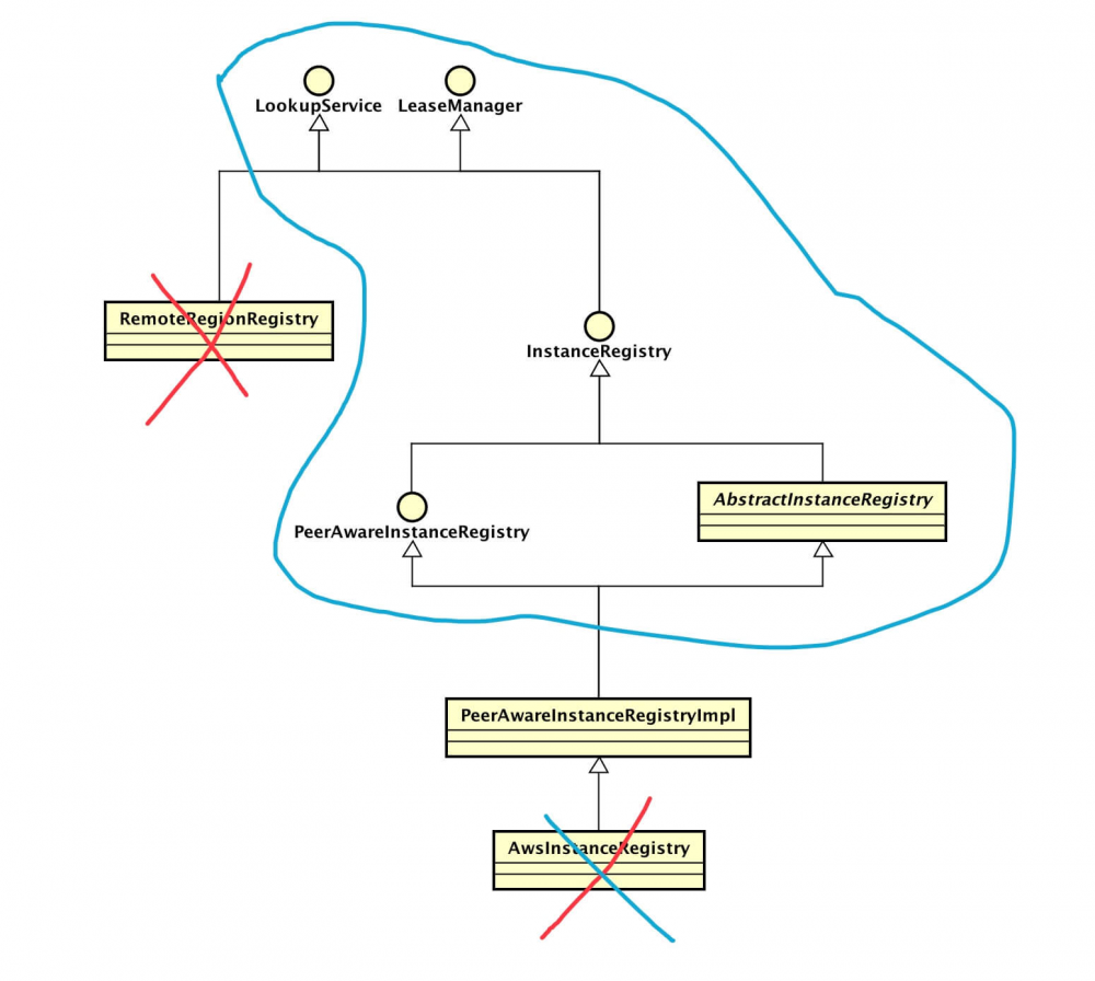 • 在 Eureka-Server 里, com.netflix.eureka.registry.InstanceRegistry 继承该接口。