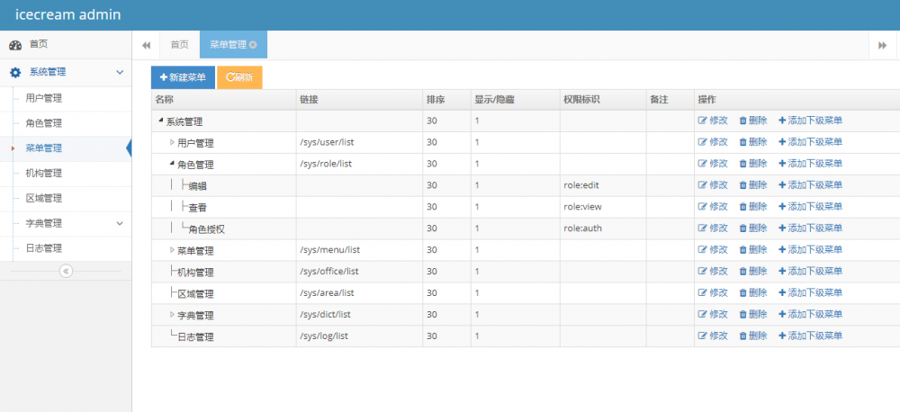 登入登出(已完成) 首页导航(已完成) 用户管理(已完成) --新增头像上传修改;个人密码修改;个人头像修改 角色管理(已完成) 菜单管理(已完成) 机构管理(已完成) 区域管理(已完成) 数据字典管理(已完成) -----添加thymeleaf自定义标签dict,更加方便使用字典 日志管理(已完成) 全局异常处理 (已完成) shiro 控制权限到按钮级(已完成) springboot多环境配置(包括logback日志)(已完成)