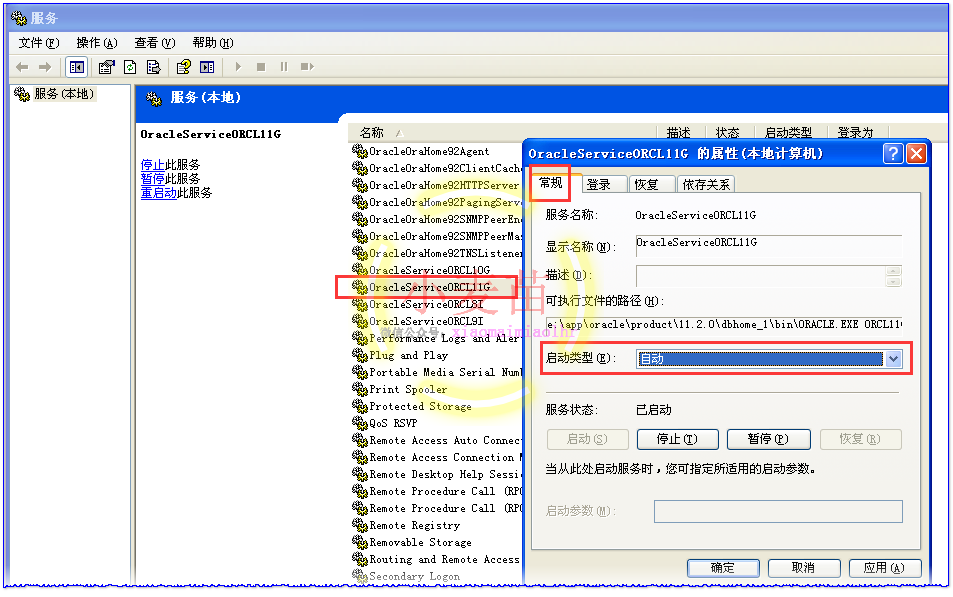 Oracle提供了伴随操作系统自动重启的功能,在Windows中,可以修改“我的电脑-->管理-->服务-->OracleService$ORACLE_SID”,或直接使用Win+R键打开运行窗口,输入services.msc即可打开服务,找到相应的Oracle服务,然后将其属性中的启动类型修改成自动。一般在Windows系统上安装完后会自动设置成自动。