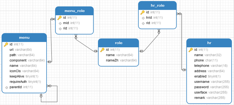3.menu表是一个资源表,该表涉及到的字段有点多,由于我的前端采用了Vue来做,因此当用户登录成功之后,系统将根据用户的角色动态加载需要的模块,所有模块的信息将保存在menu表中,menu表中的path、component、iconCls、keepAlive、requireAuth等字段都是Vue-Router中需要的字段,也就是说menu中的数据到时候会以json的形式返回给前端,再由vue动态更新router,menu中还有一个字段url,表示一个url pattern,即路径匹配规则,假设有一个路径匹配规则为 /admin/** ,那么当用户在客户端发起一个 /admin/user 的请求,将被 /admin/** 拦截到,系统再去查看这个规则对应的角色是哪些,然后再去查看该用户是否具备相应的角色,进而判断该请求是否合法。
