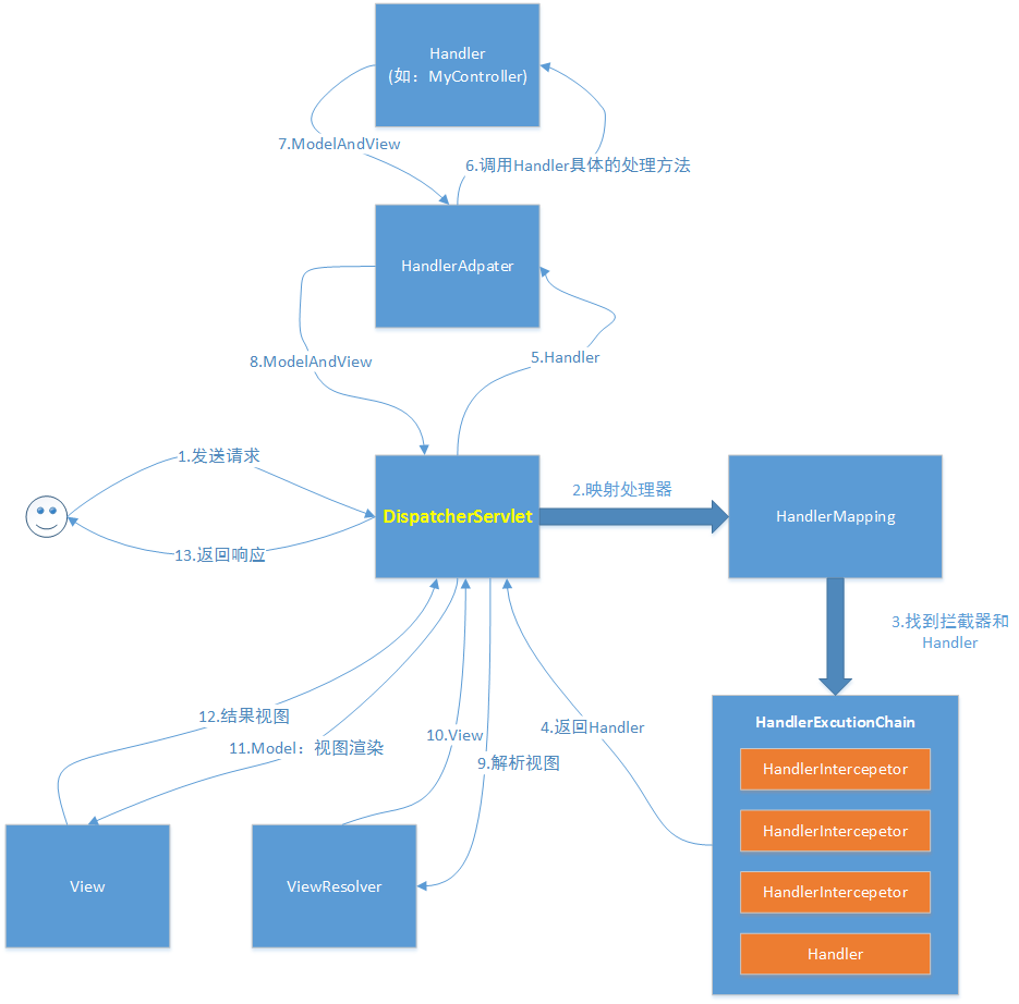 先通过下面这张图来整个了解下SpringMVC请求处理的过程;图中从1-13,大体上描述了请求从发送到界面展示的这样一个过程。