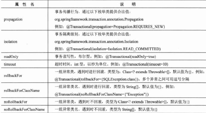 上面的代码虽然简单,也能应对大部分的场景,但还是有一些问题的,比如,有些异常开发者知道,并且想人为的控制,"抛出某类异常,不要回滚".这样的问题。这就引出了, 事务属性 这个概念, 事务属性通常由事务的传播行为,事务的隔离级别,事务的超时值和事务只读标志组成 。 这些属性都是在使用@Transactional可以指定的,我给一张表格: