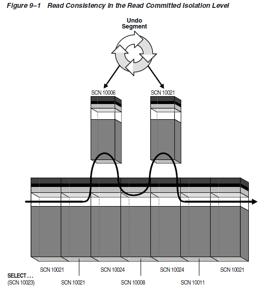 The database uses a mechanism called an SCN to guarantee the order of transactions. As the SELECT statement enters the execution phase, the database determines the SCN recorded at the time the query began executing. In Figure 9–1, this SCN is 10023. The query only sees committed data with respect to SCN 10023.
