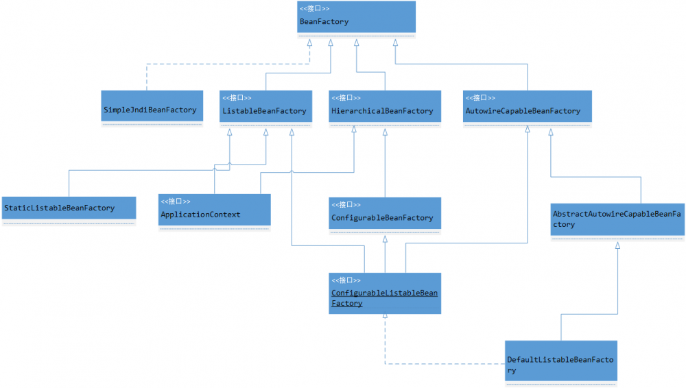 这个其实就是BeanFactory的默认实现类,它直接或者间接的实现了所有的接口。其实在看spring源码的时候都会遇到类似的设计模式,对于某一个具体的功能,通常都会定义很多层的接口,层层包装,层层委托。这种做法的好处就是,对于不同的场合都会有特定的接口;这样一来就可以在spring内部对对象的传递和转化操作都会有一些访问限制。