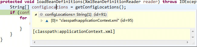 此时会将我们的applicationContext.xml读入(当然如何还有其他的spring配置文件,同样会一块拿到路径),如下图所示:
