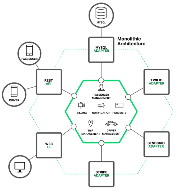 传统的WEB应用核心分为业务逻辑、适配器以及API或通过UI访问的WEB界面。业务逻辑定义业务流程、业务规则以及领域实体。适配器包括数据库访问组件、消息组件以及访问接口等。一个打车软件的架构图如下: